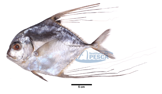 Prateado. Primeira nadadeira dorsal com 7 espinhos curtos desconectados, que desaparecem em peixes com cerca de 18 cm de comprimento. Segunda nadadeira dorsal com 1 espinho e 18-19 raios. Nadadeira anal com 2 espinhos anteriores destacados, reabsorvidos durante o crescimento, seguidos de 1 espinho e 15-17 raios.